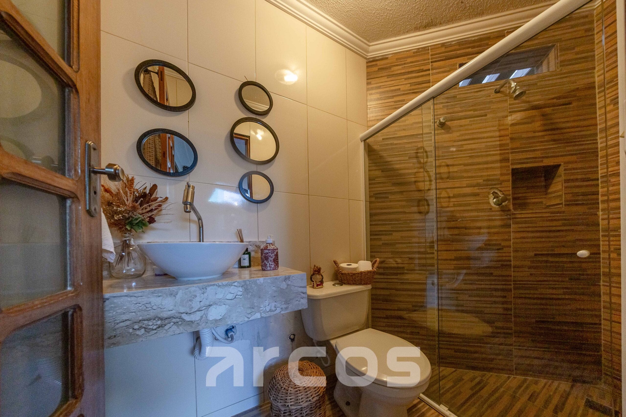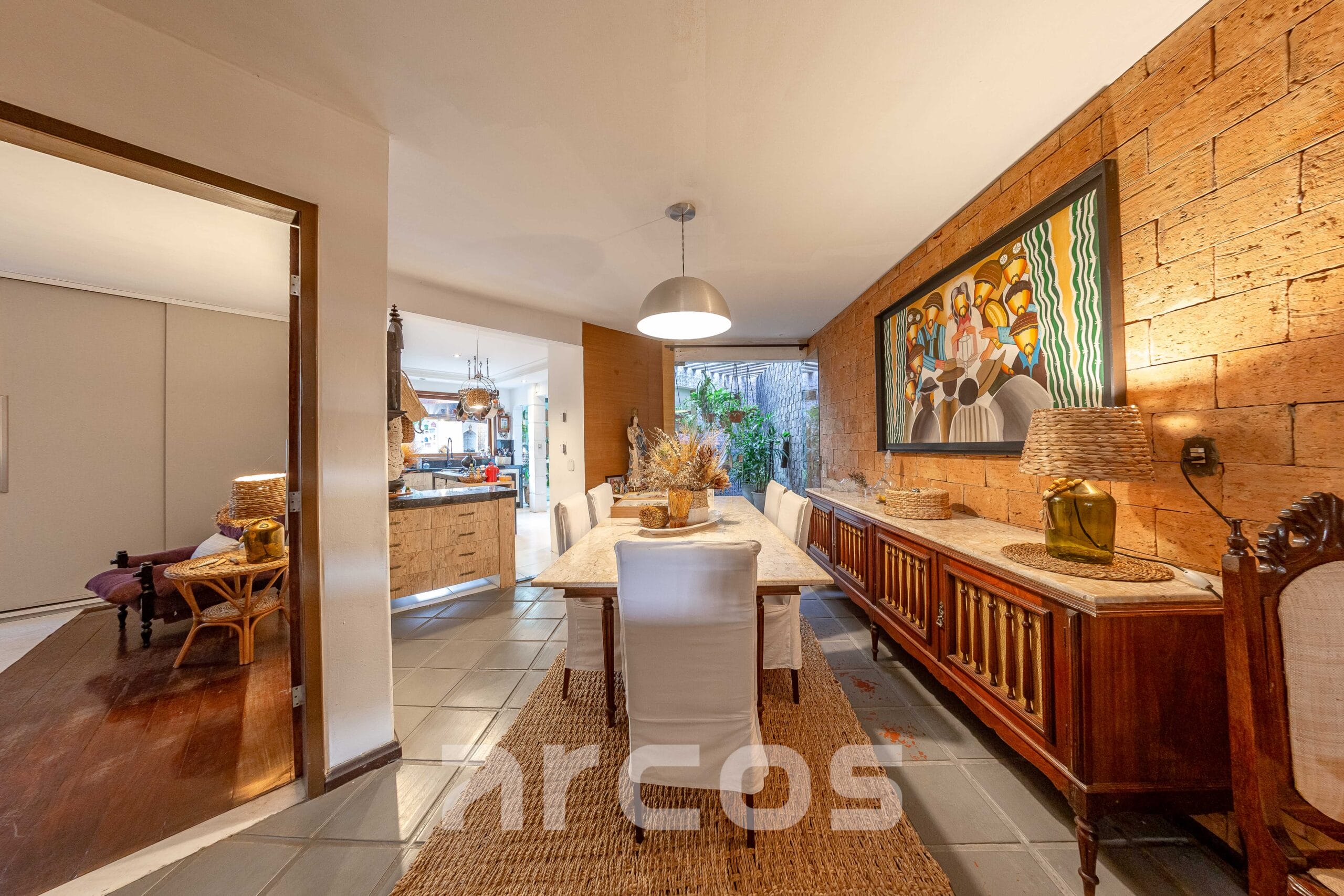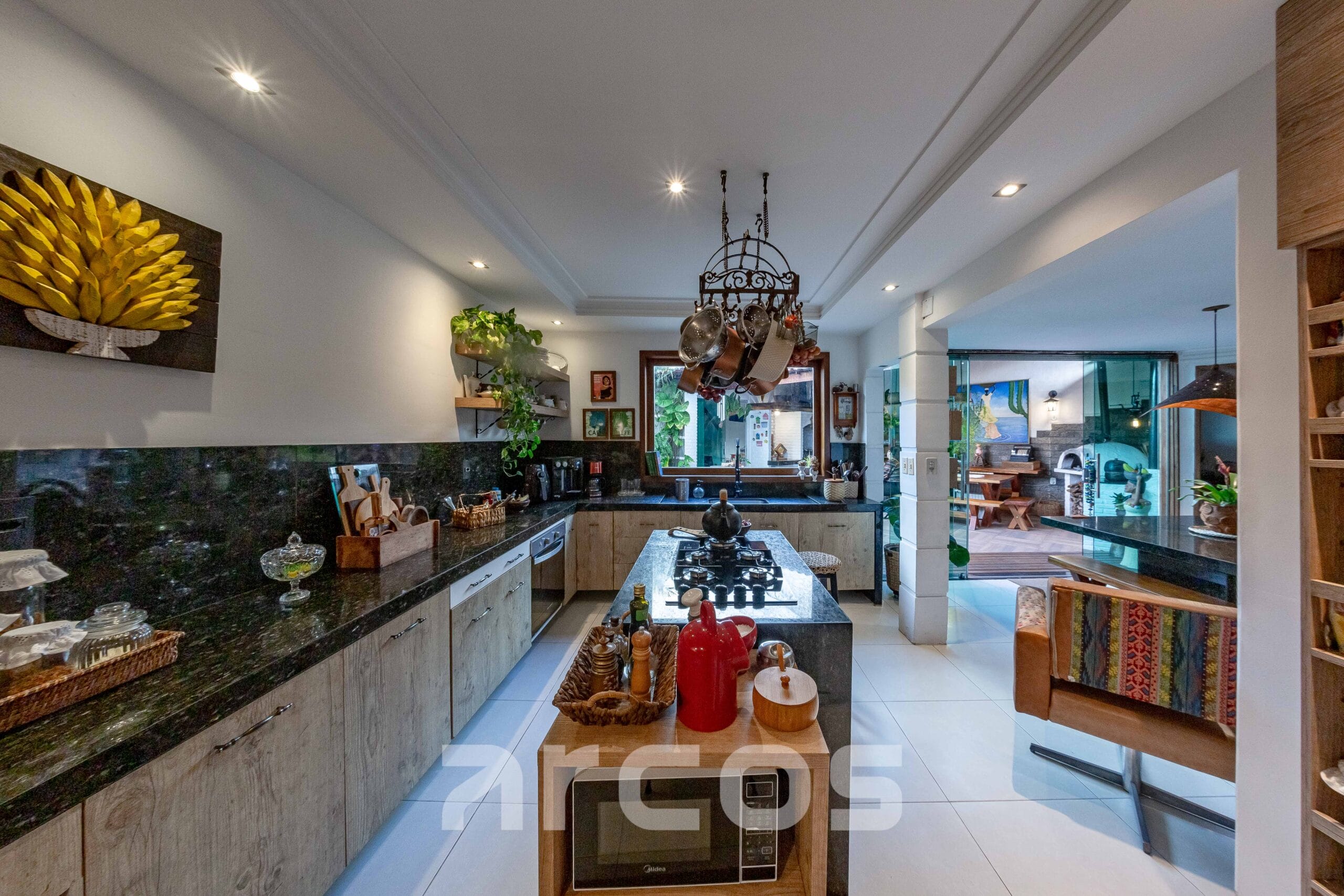 No térreo, conta com sala de estar com pé-direito alto, sala de jantar, cozinha com ilha gourmet, móveis planejados e copa, além de uma suíte, banheiro social, estúdio, área de ventilação e uma deliciosa área externa com piscina, jardim, pergolado, varanda e espaço gourmet completo com forno de pizza, fogão a lenha e churrasqueira.
